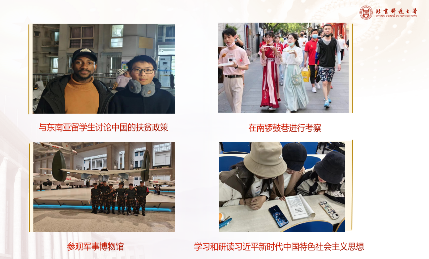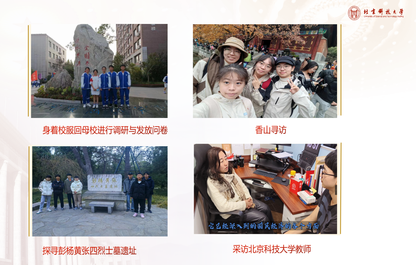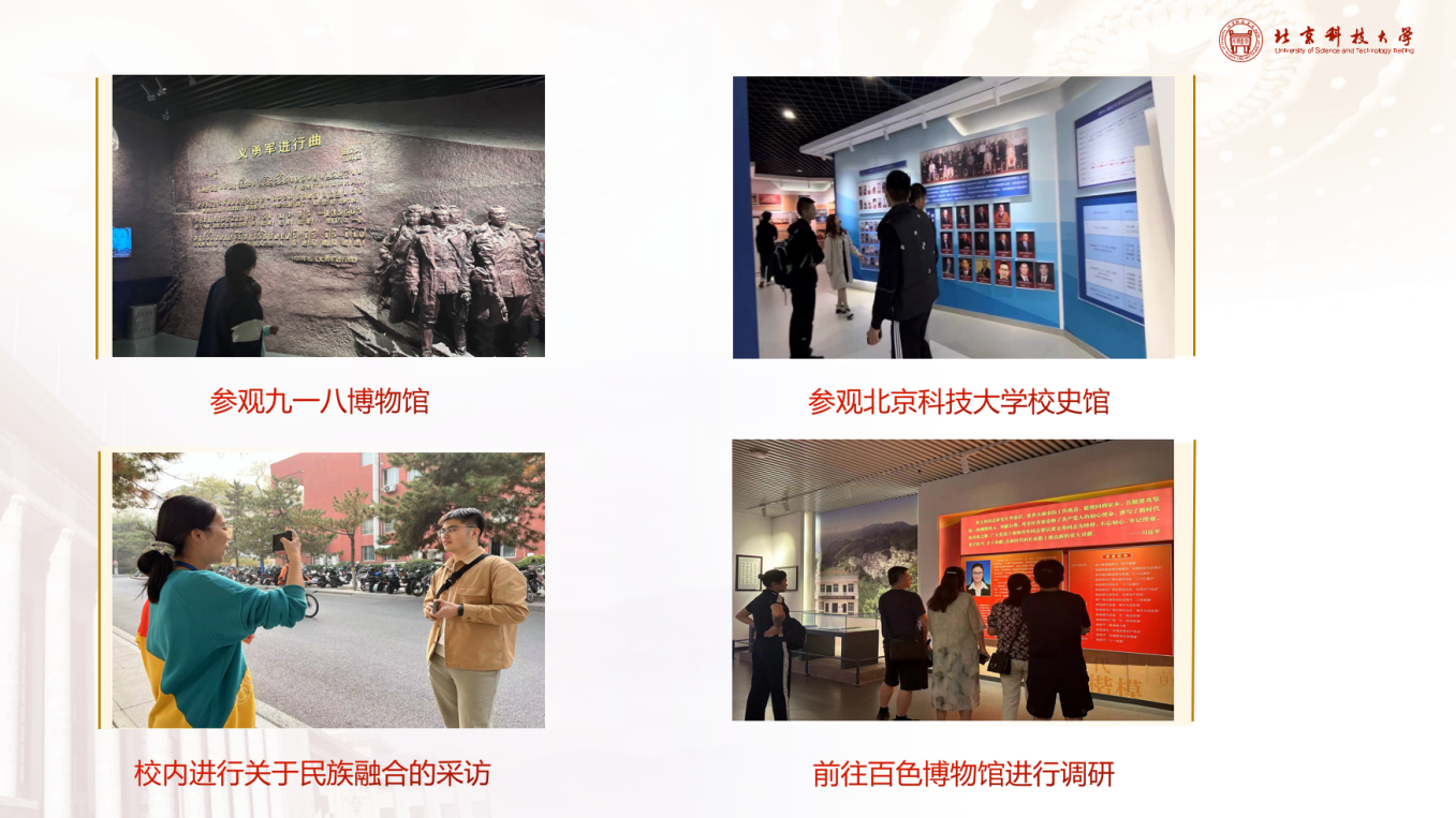 北京科技大学马克思主义学院在积极推动“习近平新时代中国特色社会主义思想概论”课程教学改革的过程中,逐渐形成了以课堂教学为主导,理论教学与实践教学相结合、学校与社会相结合,线下学习与线上学习相结合的教学模式。其中,实践教学就是打通第一课堂与第二课堂,使学生真正实现将所学理论内化于心、外化于行,推动学生做到知行合一的重要教学方式。在这个过程中,学生在老师的带领下围绕实践教学的主题制定具体的社会实践题目,走进经济政治文化社会生态各领域的具体场所了解社会的发展,走进历史展览馆、纪念馆、博物馆感悟历史的变迁。以实践教学为抓手,校内校外思政资源正在向着有机统筹的整体性建设方向发展,为“大思政课”建设作出积极探索。