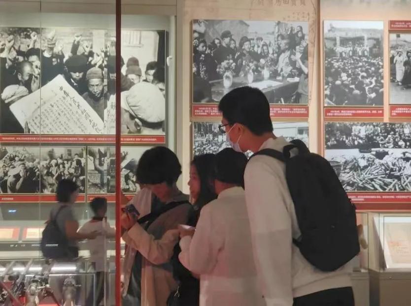 (同学们在中国共产党历史展览馆内认真记录见闻和感受)