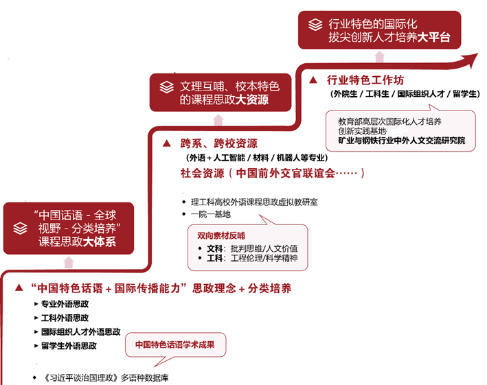 依托教育部高层次国际化人才培养创新实践基地、矿业与钢铁行业中外人文交流研究院、教育部教育数据研究团队等校内资源,借力北京地区七所理工科高校外语课程思政虚拟教研室建设,整合材料科学、人工智能等新工科专业资源及中国前外交官联谊会等校外课程思政资源,以文理融合为特色,构建双向赋能、内外协同的课程思政资源体系,实现外语教育“本色”与行业院校“特色”的有机统一。