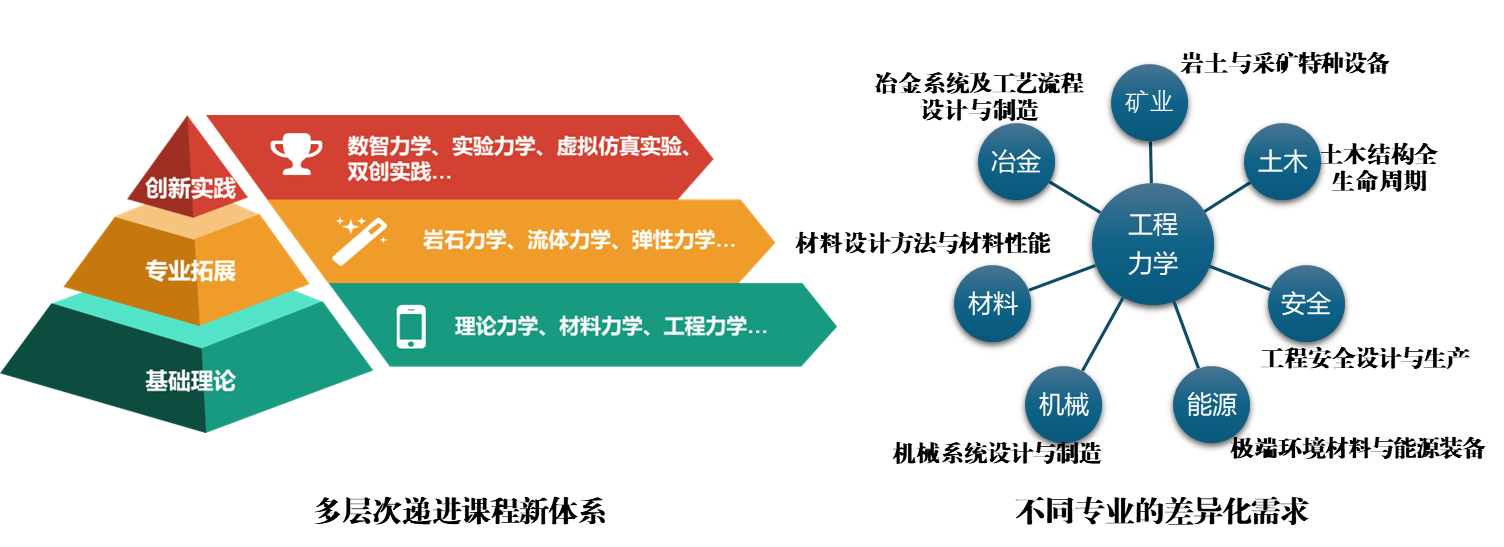 ②“力学赋能”交叉融合:与矿冶学科群深度融合、相互支撑,主动、系统地融入矿冶行业基础学科人才培养全过程。将人才培养的起点从满足当前岗位技能前移至基础创新,激发力学基础理论驱动前沿创新。