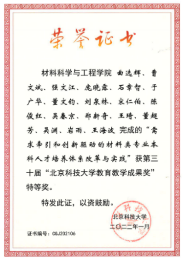 2023年曹文斌获2023年宝钢优秀教师奖;2022年曹文斌获北京市课程思政教学名师和教学团队成员;2021年曹文斌获北京市普通高校优秀本科毕业设计优秀指导教师、北京科技大学第二十二届“我爱我师——我心中最优秀的老师;2020年曹文斌指导第六届中国国际 “互联网+”大学生创新创业大赛总决赛主赛道金奖;2017年曹文斌获北京市优秀教师荣誉称号。