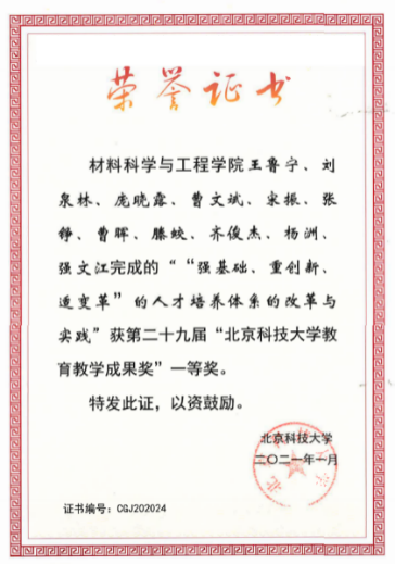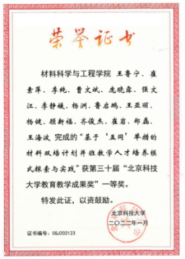 2021年薛润东获全国高校教师教学创新大赛一等奖。2023年薛润东获北京高校优秀本科实验教学指导教师,2024年薛润东被评为北京科技大学优秀工程师。马春梅2023年获北京科技大学第十三届青年教师教学基本功比赛一等奖。