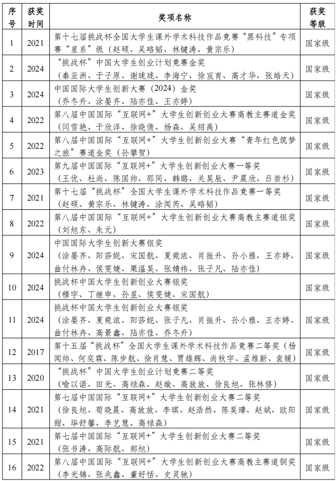 自2017年至2024年,北京科技大学材料科学与工程学院本科生获得包括挑战杯全国大学生课外学术科技作品竞赛、中国国际大学生创新大赛、中国国际“互联网+”大学生创新创业大赛在内的国家级奖项22项,获得省部级奖项6项。
