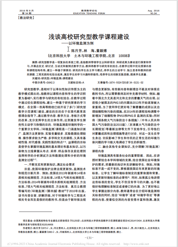 《环境监测》作为环境工程等专业的核心主干课程,教学团队经过多年探索与实践,以提升学生生态文明意识和树立生态文明观为核心导向,逐步形成了“12345”教师素质提升模式,构建了兼具时代性、时效性、社会热点聚焦性和生态文明进步体现性的“四维扩展式”课程思政素材体系,并构筑了以社会与国家需求为目标的“六层次递进式”人才培养模式。