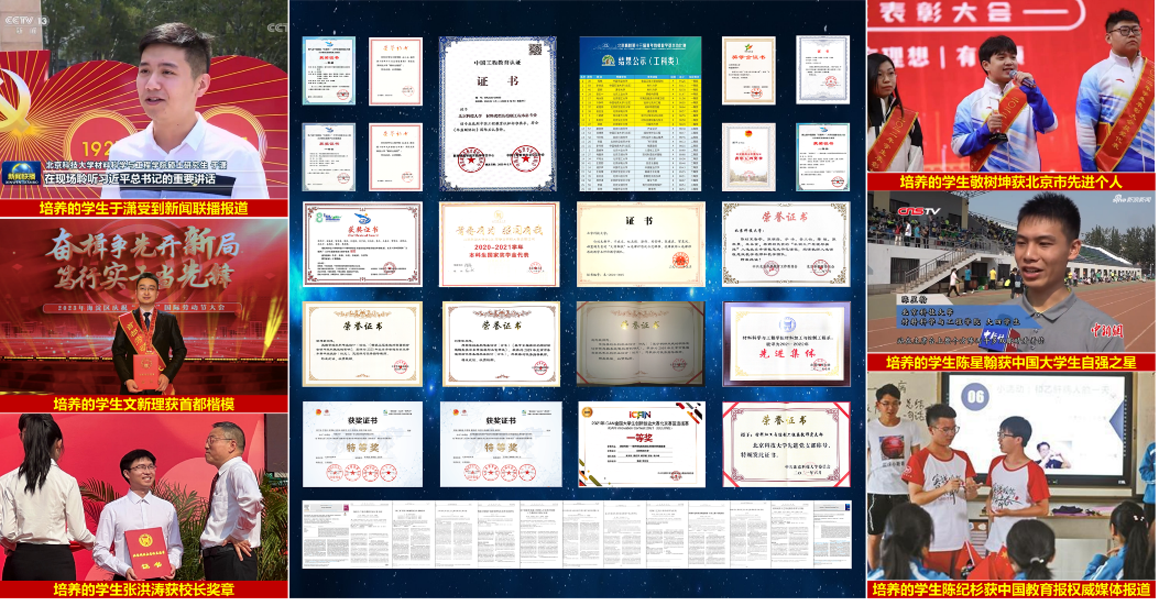 ①培养了400余名听党话、跟党走、有理想、有本领的高素质人才,20%毕业生到中西部基层贫困地区支教或工作。19届毕业生于潇受到新闻联播采访并报道了学习总书记建党百年重要讲话精神优秀事迹;“青春榜样、逆火英雄”20届毕业生陈星翰获得2019年度中国大学生自强之星;21届毕业生敬树坤等参与的冬奥志愿者团队获党中央、国务院授予的“北京冬奥会、冬残奥会突出贡献集体”;22届毕业生陈纪杉带队赴贵州为听障儿童讲授10门心理健康、传统文化、职业模拟精品课程,获得中国教育报等权威媒体报道。②培养本科生创新能力显著提升。发表高水平论文或申请专利本科生占比约20%,获“挑战杯”、“互联网+”等创新创业奖励累计58人次,获国家奖学金、北京市优秀生、优秀毕业论文36人次,本科生读研深造比例超过68%、本校深造率超过81%。其中,刘旭东等获得“互联网+”大赛全国银奖,母镕等获得“挑战杯”北京赛区特等奖,张洪涛获北京科技大学“校长奖章”。