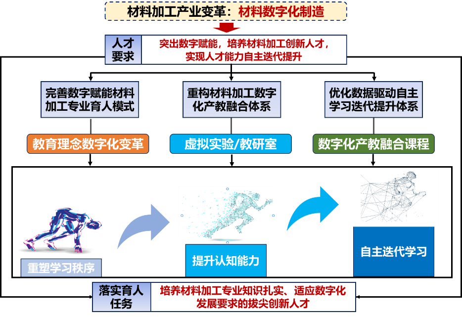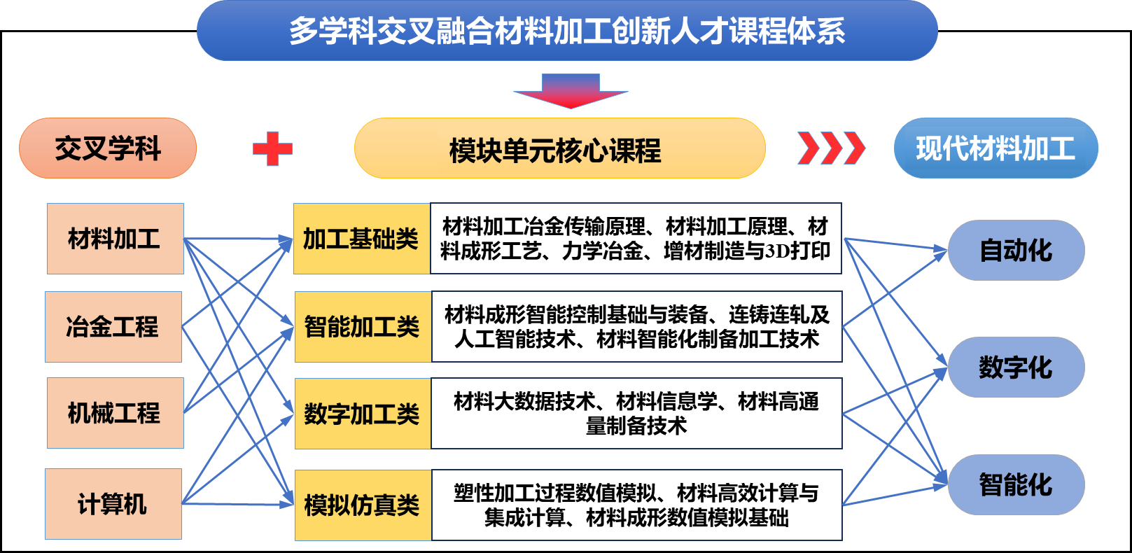 针对传统以深挖和教授专业基础理论为特点材料加工育人体系存在的不足,以服务材料加工产业数字化转型为目标,提出“材智合一、数字赋能”育人理念,构建以“学科交叉、科教/产教融合、数字赋能”为特点的育人体系,解决教学问题的具体举措体现在: