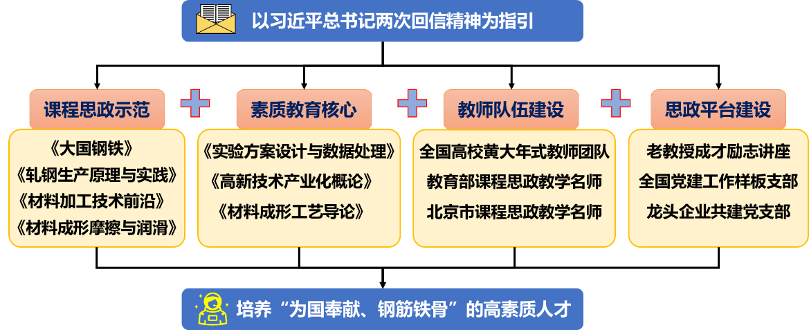 践行习近平总书记给北京科技大学的两次重要回信精神,把“严谨治学、甘为人梯”的“北科精神”融入到课堂教学与科研实践各环节中,用科学思想、科技前沿、创新精神育人,孕育了《大国钢铁》、《轧钢生产原理与实践》、《材料加工技术前沿》等一批课程思政示范课,构建了老教授成才励志讲座、全国党建工作样板支部等思政平台,寓价值观引导于知识传授和能力提升之中,为新型育人体系建设奠定基础。