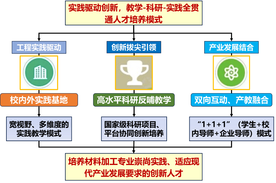 坚持“实践驱动创新”理念,改革创新人才实践教学规划,将新金属材料全国重点实验室等宽视野、多维度的平台统筹纳入本科生工程实践体系,鼓励与支持学生依托平台参与国家级科研创新项目,科教融合协同增进课堂听课与科研工作效果;通过出国访学、企业顾问、政府挂职、联培博士后等模式提升专业教师队伍工程实践教学能力;建立校企协同育人平台,聘请龙头企业一线科技专家担任本科生企业导师,采用“1+1+1”(学生+校内导师+企业导师)培养模式,产教融合培养具备解决复杂工程问题能力的拔尖创新人才。