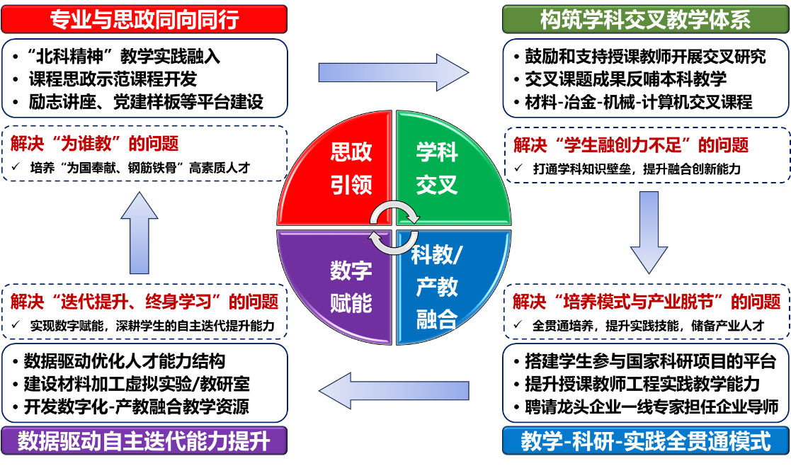 为破解上述难题,本专业以国家“双一流”学科建设为依托,全面推进教学体系改革。聚焦材料加工产业数字化转型需求,提出了“材智合一、数字赋能”育人理念,以“培根北科精神”、“打通学科知识壁垒”、“践行全贯通培养”、“实现数字赋能迭代提升”为抓手,构建并实施了“学科交叉、科教-产教融合、数字驱动”的新型育人体系,培养了大批政治过硬、创新能力强、实践能力强、迭代提升能力强的材料加工专业拔尖创新人才。