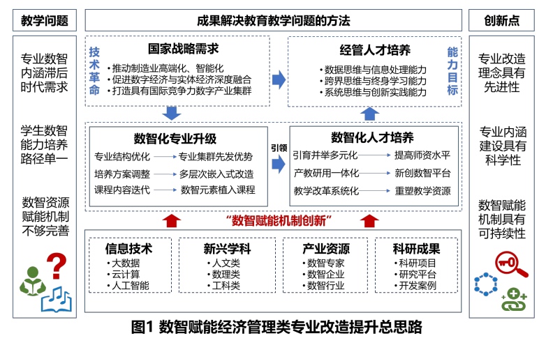 经管人才培养存在如下问题:第一,文理工交融停留形式,课程体系数智化程度不高,跨学科协同育人不够深入,无法实现知识有机融合与创新,难以支撑学生“数智+经管”复合能力培养。第二,经管人才培养过程缺乏基于智能工具和真实数据的教学资源与互动场景,教学内容与前沿技术和行业实践脱节,学生实践能力与岗位需求存在明显差距。第三,信息技术、新兴学科、产业资源、科研成果与教育教学之间缺乏深度协同创新机制,制约了新文科建设的持续推进和成效落地。