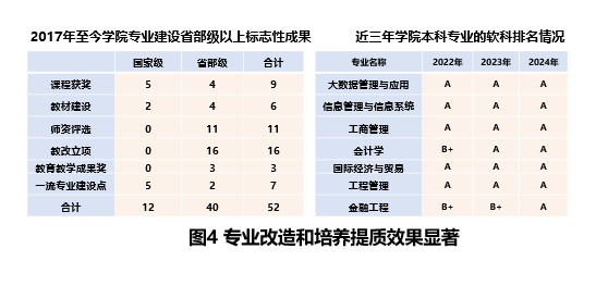 学院以改革创新为牵引推动专业优化,数智赋能经管类专业持续改造升级,专业数智化特色凸显。2017年以来,学院获批与“四新”建设和专业优化相关的教育部“产学合作协同育人项目”14项、校级本科教改各类项目28项;2019年,学院开展的协同育人模式改革获北京市立项;2021年,学院申报的教育部首批新文科研究与改革实践项目成功获批并在三年后结题验收中获评“优秀”。2017年以来,学院产生国家级一流本科专业建设点5个,北京市一流本科专业建设点2个,国家级一流本科课程5门,教育部课程思政示范课1门、北京市优质本科课程3门、高校优质本科教材4本,11人次获省部级及以上教学人才称号。大数据管理与应用专业实现专业排名和毕业生满意度“双高”,软科最新排名在全国145所高校中名列第9,首届毕业生学生对教学水平和教学方法的满意度均为100%,居全校50余个专业之首。学院七个专业全国排名三年从5A2B到6A1B到7A,专业建设成果显著。