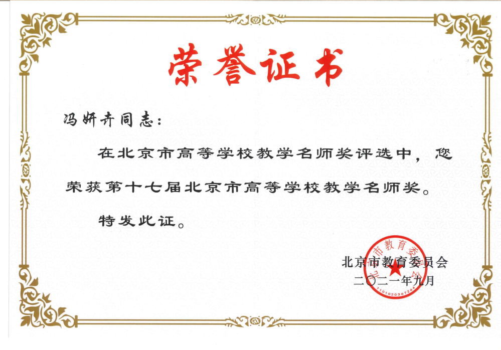 [5] 2021年,第十七届北京市高等学校教学名师奖:冯妍卉