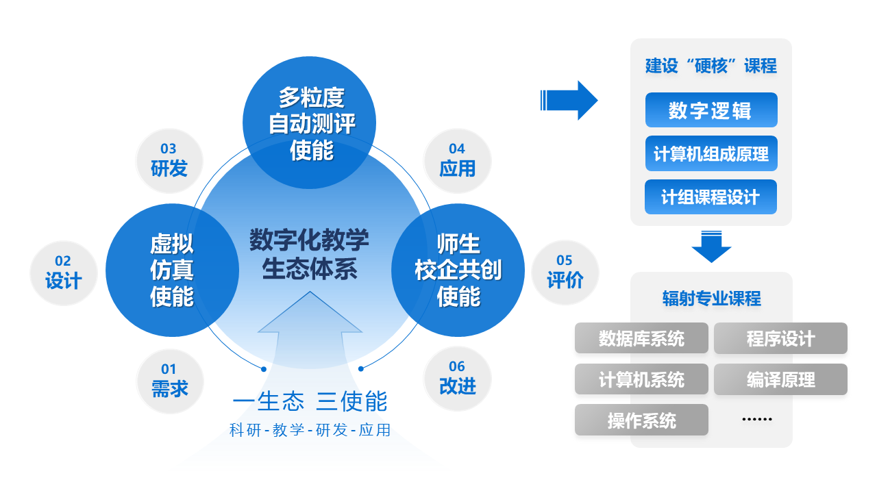 本成果通过虚拟仿真、多粒度自动评测以及师生校企共创数字化教学的“三使能”方法,构建起科教研用融通的“硬核”课程数字化教学生态,助力学生建立硬件并行思维与系统认知,全面提升复杂硬件工程能力,并辐射带动计算机系统能力课程体系数字化转型升级。