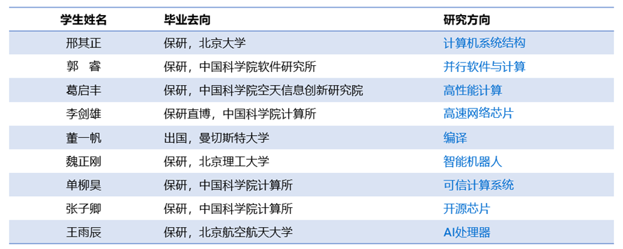 学生参加全国大学生计算机系统能力大赛,战绩出色,获奖20项,数量在全国211高校中排名第1。本专业毕业生邢其正、卢旭等基于项目成果完成的本科毕业设计获评北京市优秀毕业设计,并作为优秀学生代表多次在全国高校计算机类专业系统能力培养论坛上分享经验,项目参与学生数十人至清华、北大、曼彻斯特大学等国内外顶尖高校从事芯片设计相关研究。