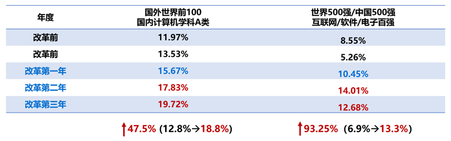 成果带动硬件课程体系改革,提升学生就业及深造竞争力。近五年,本专业应届毕业生进入世界500强、中国500强、中国互联网百强等知名企业就业比例提升了103%,进入国内外顶尖高校(学科评估A类高校、国外Top 100高校)深造比例分别提升了40%和55%。