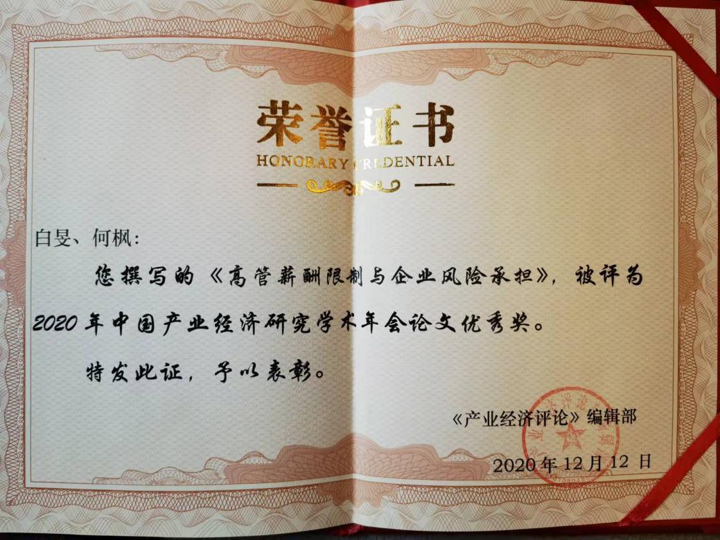 4、第七届中国产业经济研究学术年会优秀论文奖,2020
