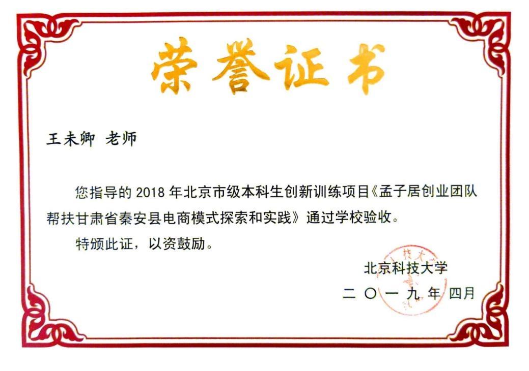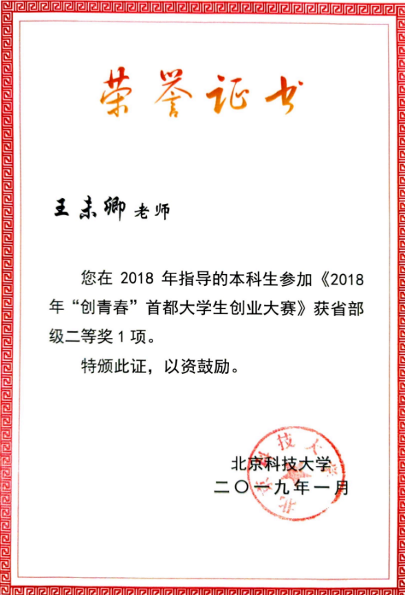 18、2018年“创青春”首都大学生创业大赛省部级二等奖指导老师,2018