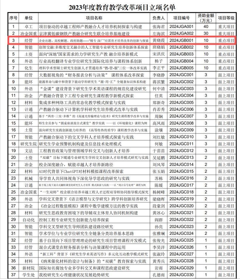 16、北京科技大学研究生教改重点项目《企业出题、高校解题、政府助题——“精专深广”应需育才培养改革的创新与探索》,2024
