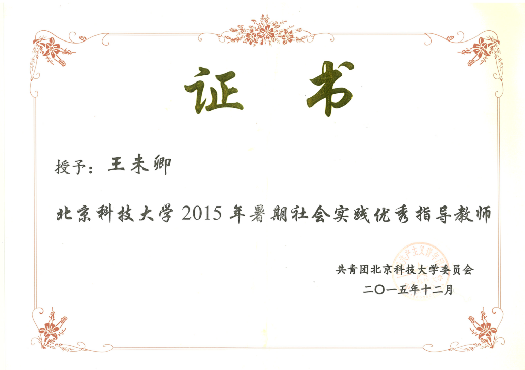4、北京科技大学第十六届“我爱我师——我心目中最优秀的老师”荣获“专业课优秀老师”奖项,2015