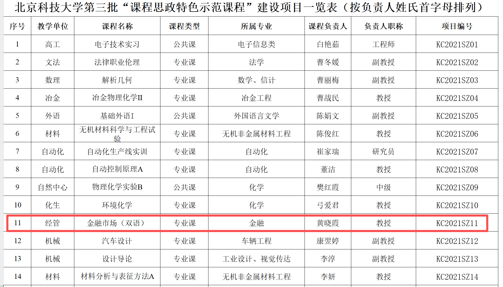 14、北京科技大学第三批课程思政特色示范课程《金融市场(双语)》,2021