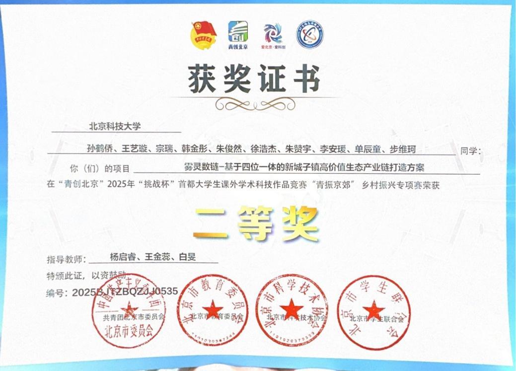 6、“青创北京”2025年“挑战杯”首都大学生课外学术科技作品竞赛“青振京郊”乡村振兴专项赛二等奖指导教师,2025