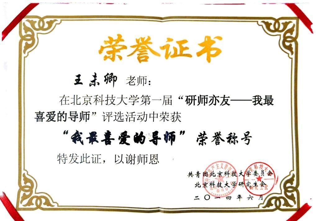 5、北京科技大学第一届“研师亦友——我最喜爱的导师”称号,2014