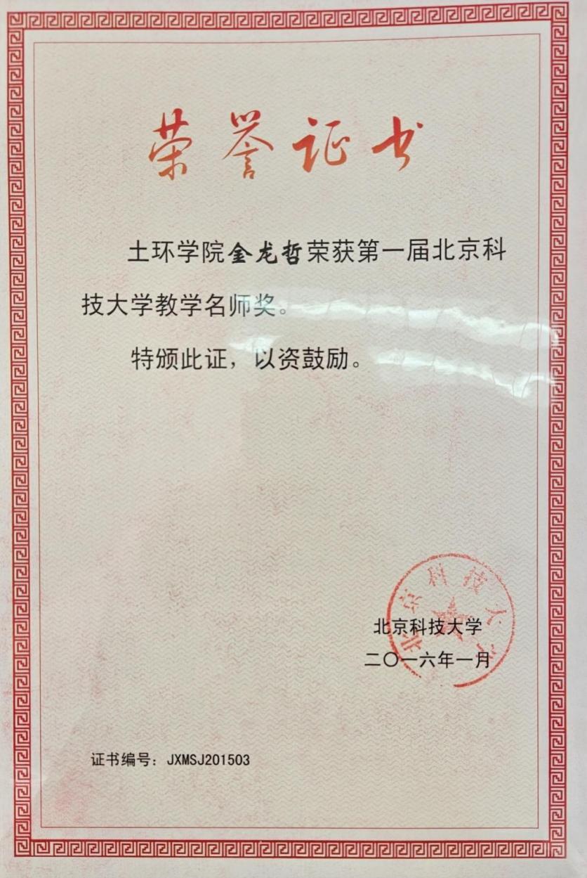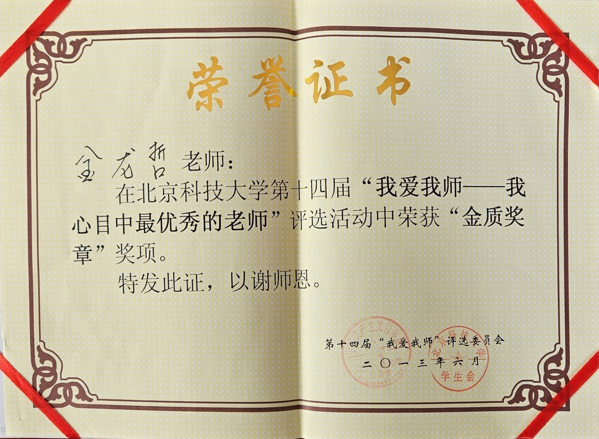 46.北京科技大学“我爱我师—我心目中最优秀老师”金质奖 金龙哲