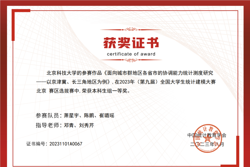 2023年(第九届)全国大学生统计建模大赛 北京赛区一等奖(萧星宇等)指导教师 |