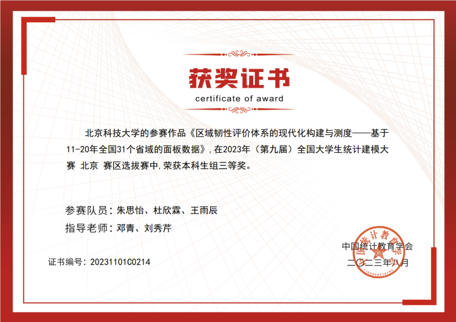 2023年(第九届)全国大学生统计建模大赛 北京赛区三等奖(朱思怡等)指导教师 |