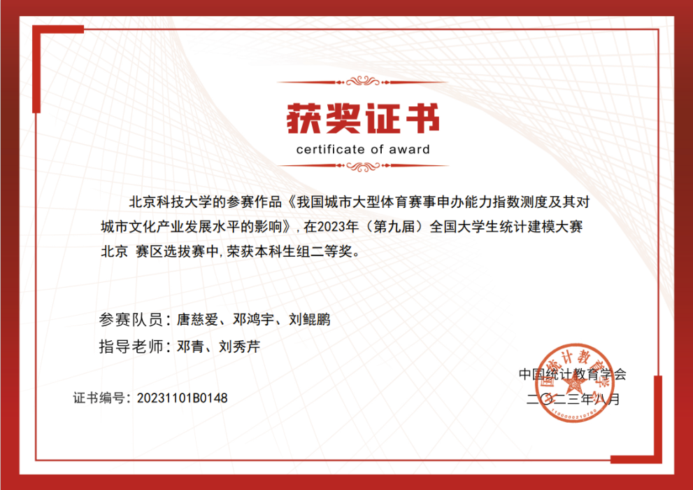 23.2023年(第九届)全国大学生统计建模大赛北京赛区二等奖(唐慈爱等)指导教师 邓青