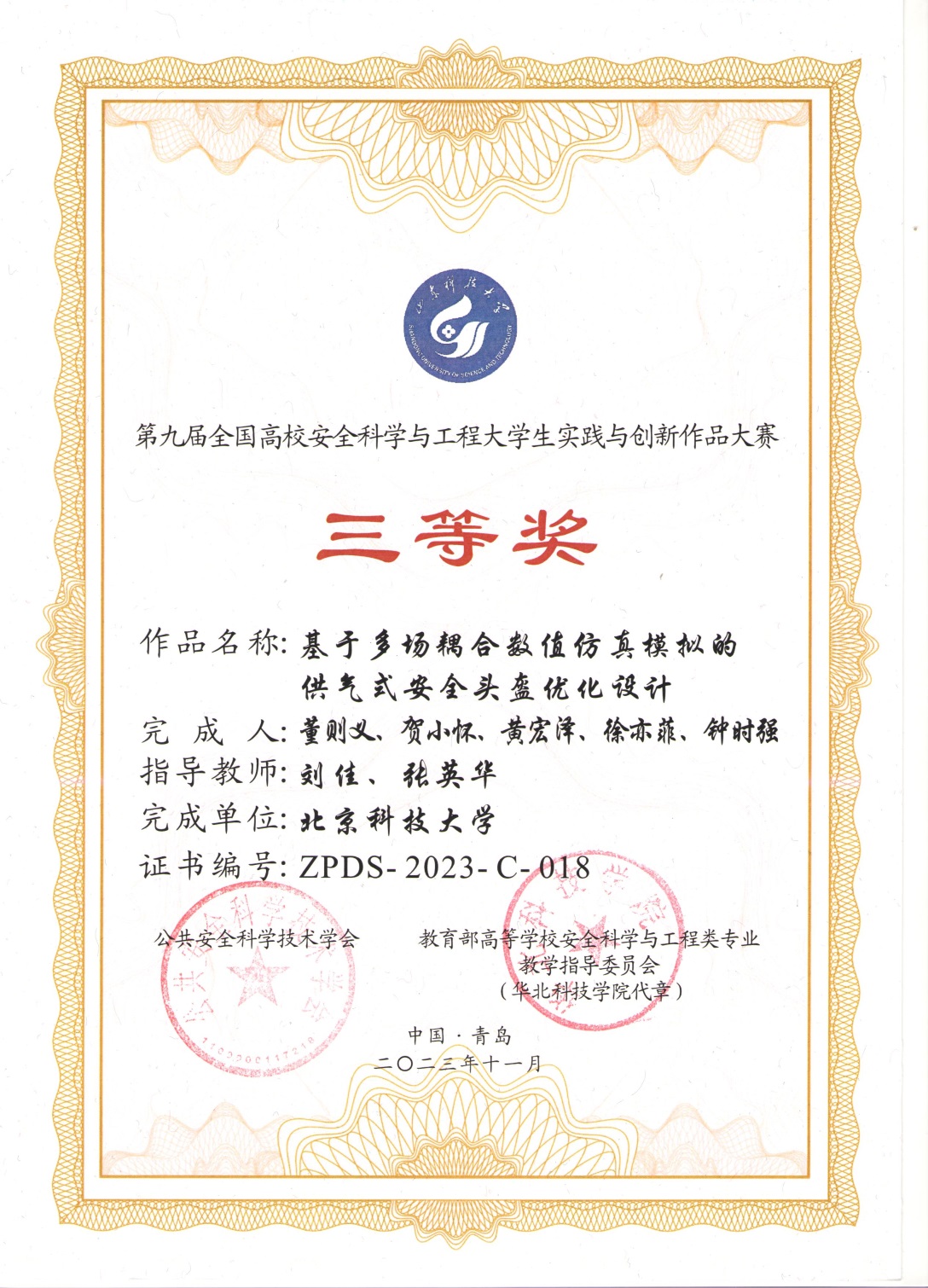17.第九届全国高校安全科学与工程大学生实践与创新作品大赛三等奖指导教师 刘佳张英华