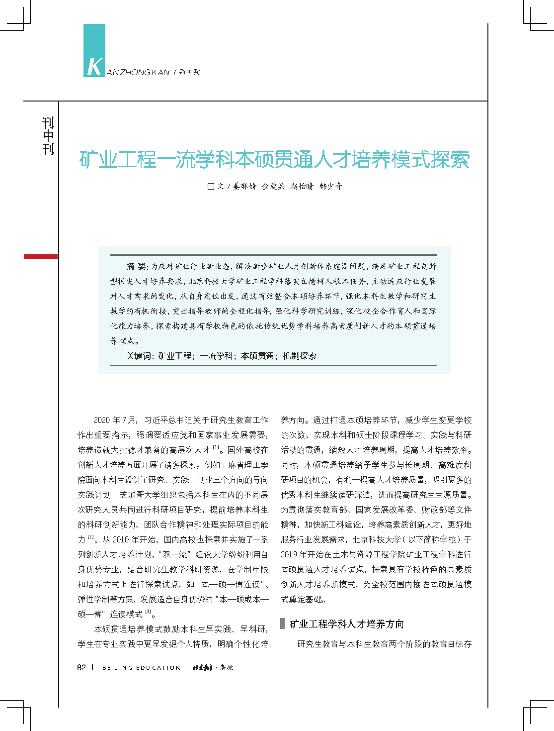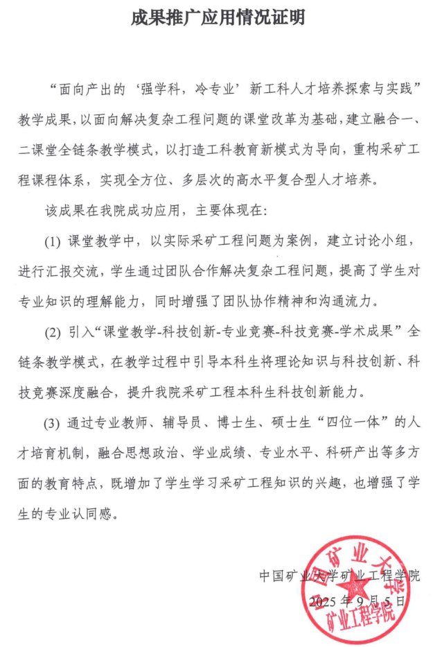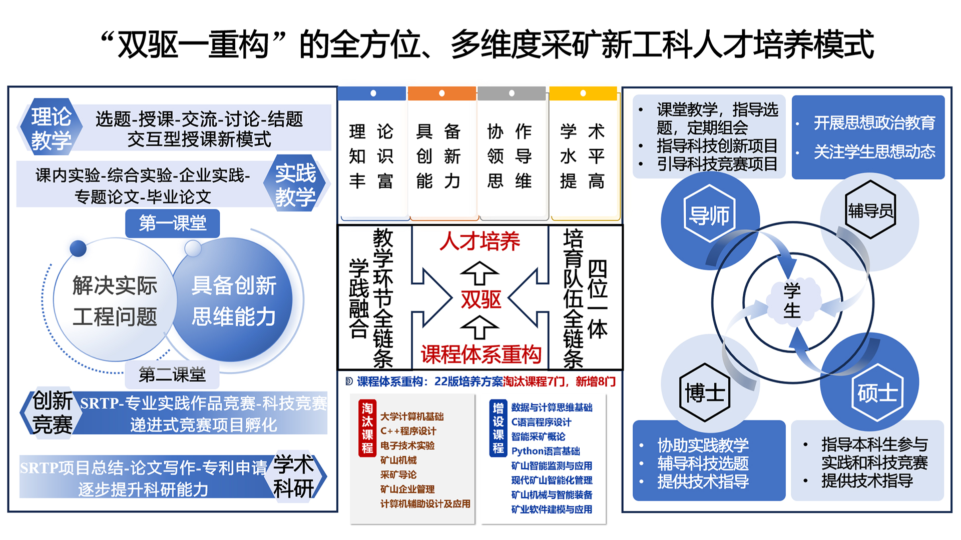 本成果创新变革“新工科”人才培养教育模式,以学生最终学习成果为导向,以课堂教学改革为基础,以科教融合为支撑,建立“授受结合,科研反哺”的互动式课堂教学模式,融入实践教学,构建课堂与实践创新相结合的“教学环节全链条”;以全程导师和辅导员为主导,以硕、博士研究生为抓手,建立协同育人机制,形成全程导师、辅导员、硕士生、博士生四位一体“育人队伍全链条”,实现全方位、多层次的育人机制。面向新技术、新业态,重构采矿工程课程体系,协同培育具有较高思想素质、较强专业素养和创新能力的高水平复合型人才。最终形成以采矿工程课程体系重构为基础,以“教学环节全链条”和“育人队伍全链条”为驱动,以高水平复合型人才培养为目标的“双驱一重构”采矿新工科人才教育模式。