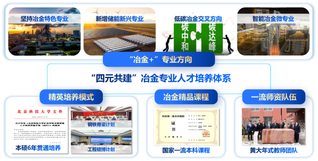 聚焦冶金工业绿色数字转型需求,打造“冶金+”交叉专业体系,以冶金工程为根基、建设储能新兴专业,建设低碳智慧冶金、碳中和冶金新方向,推行冶金数字孪生、冶金大数据技术微专业。全面实施本科生导师制和六年本硕贯通培养,设立钢铁脊梁和工程硕博校企联合培养。强化名师和团队领衔的有组织教学,重构本研贯通冶金课程体系,建成一批国家级团队、名师、课程和教材,全面保障培养冶金一流人才。