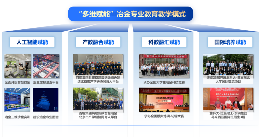 建设“数智平台-智慧教室-专业图谱-虚拟实训”冶金专业全方位智慧教育新生态,创设“导师-教材-课程-平台”冶金业多层次产教融合育人新模式,打造“基础认知-综合实训-以赛促教-技术创新”冶金专业全链条科技创新能力培养新体系,构建“国际课程-短期游学-联合培养”冶金专业进阶式国际化教育新范式,推动教育教学模式与方法的全面创新,多措并举加快了世界冶金教育科研中心建设步伐。