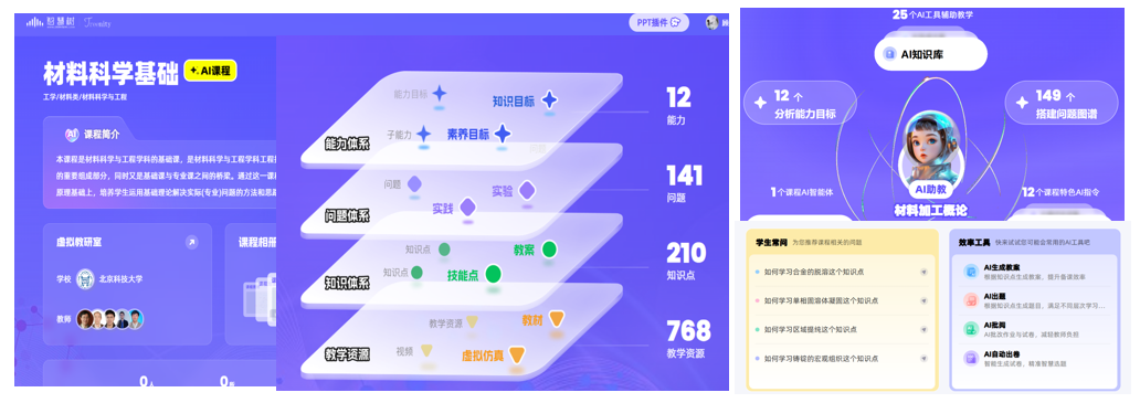 构建了教学智能体,实现了AI与教育的深度融合,构建的课前、课中、课后与实验四环节的智慧化教学体系与精准教学评价方法得到广泛认可。“基于知识图谱和虚拟仿真的智慧教学新模式”、“ChatGPT辅助教学”两项教学案例入选教育部典型案例;依托“操作预判-偏差预警-智能导引”实验教学方式,兰州理工大学等7所中西部高校、1000余名学生借助数智化平台完成了相关实验、实习与实践课程,操作技能大幅提升,有效促进了西部地区材料教学水平的提升。