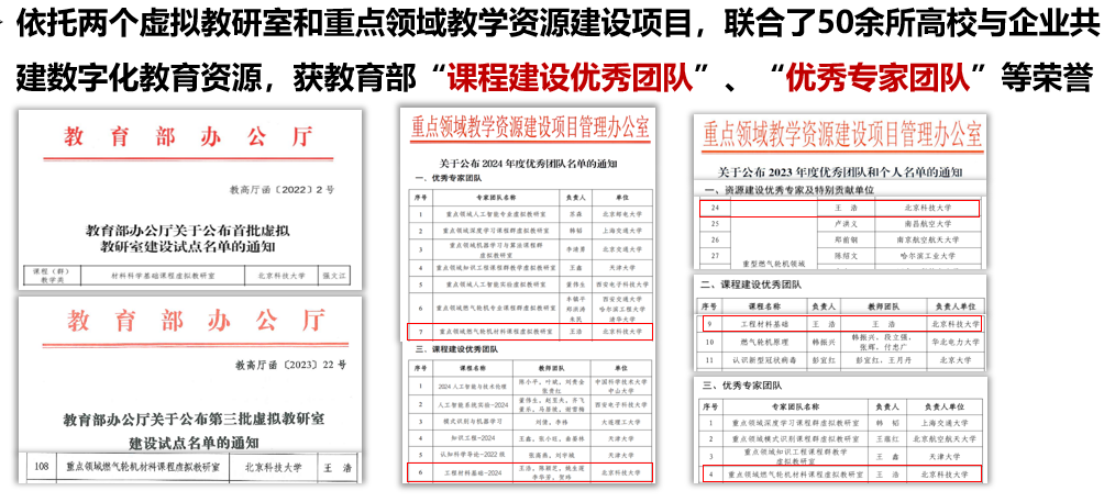 所构建的系列基础课、专业课在线课程、知识图谱、练习习题、案例等数字化教学资源、“金属材料成分、工艺、组织和性能一体化设计虚拟仿真实验”虚拟仿真资源、扫描电镜数智化平台等,通过教育部首批虚拟教研室“材料科学基础”课程教研室、教育部重点领域燃气轮机课程虚拟教研室平台,与50余所高校、大型央企开展共享,显著提升了学生学习成效和创新能力。
