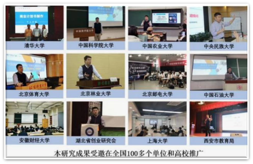 本成果已被东北大学、华南理工大学、中国石油大学、西北工业大学等70多所高校采纳和应用,支持建设和完善了“创新创业基础”“创业融资”“精益创业”“商业计划书制作”等多门创业课程;成果完成人就本成果内容接受全国工商管理专业教指委、教育部创新方法教指委、清华大学、中国农业大学、中国科学院大学、北京交通大学等100多个单位和高校邀请举办培训和讲座,培养创业师资1000多人。