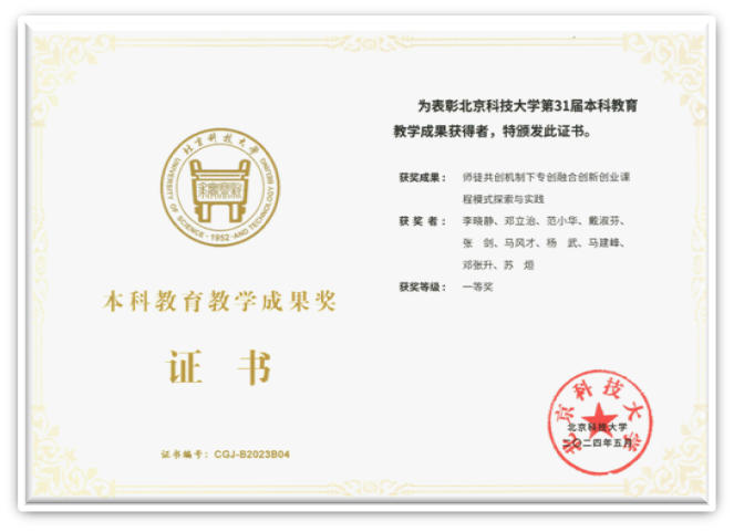 1. 2024北京科技大学第31届教育教学成果奖“师徒共创机制下专创融合创新创业课程模式探索与实践”(李晓静为负责人)