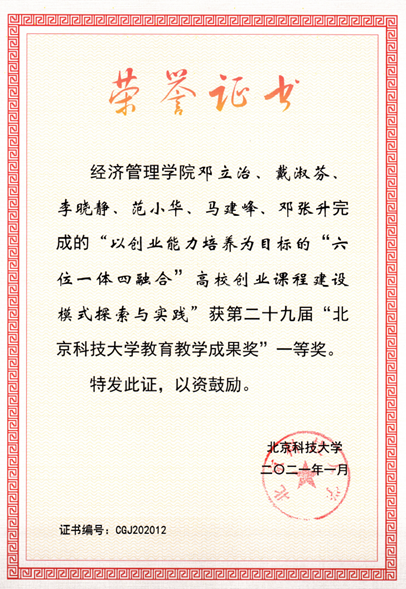 5. 2021北京科技大学第二十九届教育教学成果一等奖“以创业能力培养为目标的“六位一体四融合”高校创业课程建设模式探索与实践”(邓立治/戴淑芬/李晓静/范小华/马建峰/邓张升)