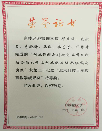 6. 2017北京科技大学第二十七届教育教学成果特等奖“创业教学与创业项目相融合的大学生创新创业能力培养模式探索与实践”(邓立治/戴淑芬/李晓静/邓张升等)