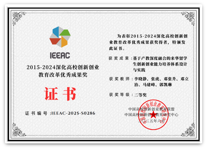 4. 2015-2024年深化高校创新创业教育改革优秀成果“基于产教深度融合的来华留学生创新创业能力培养体系设计与实践”获得优秀报告类成果二等奖(李晓静张虎邓张升邓立治马建峰郭凯琳)