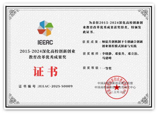 3. 2015-2024年深化高校创新创业教育改革优秀成果“师徒共创机制下专创融合创新创业课程模式探索与实践”获得优秀实践类成果一等奖(李晓静/邓张升/邓立治/马建峰)