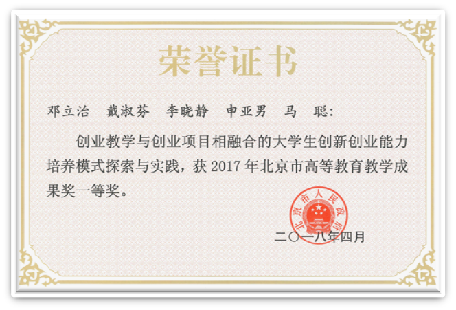 2. 2018北京市高等教育教学成果奖一等奖“创业教学与创业项目相融合的大学生创新创业能力培养模式探索与实践”(邓立治/戴淑芬/李晓静等)