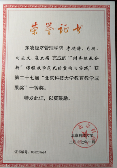 7. 2017北京科技大学二十七届教育教学成果一等奖“财务报表分析教学范式重构与实践”(李晓静)