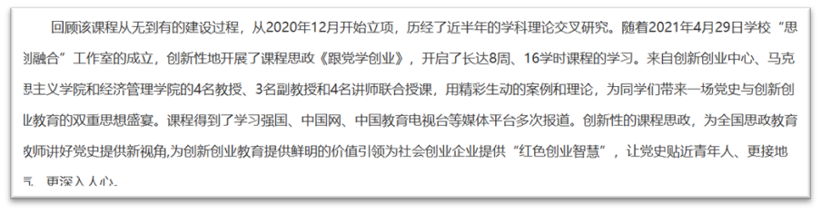 (2)“思创融合”创新创业教育特色课程“跟党学创业”课程建设与相关报道与影响力(成果完成人创新创业中心部长邓张升创新创业研究中心负责人邓立治参与该创业课程筹建和实施)