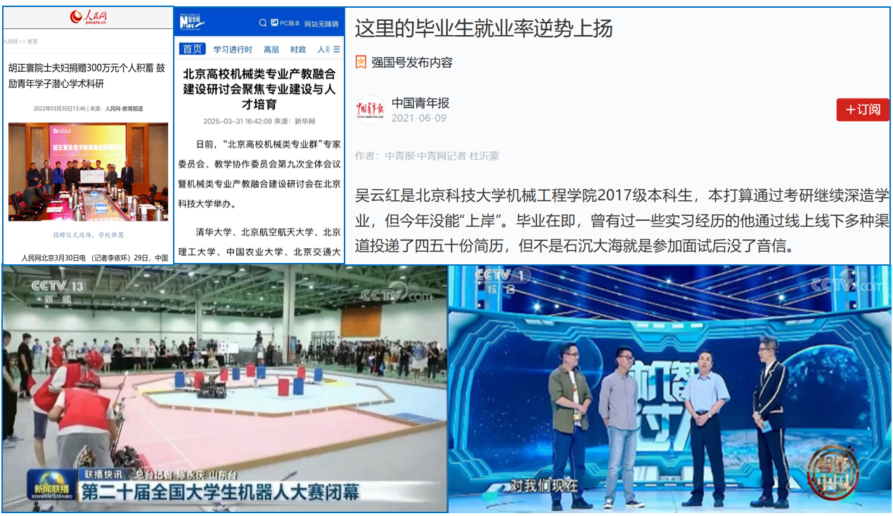 成果获央视、新华网、人民网等媒体专题报道20余次。2025年新华网报道我院举办北京高校机械类专业产教融合建设研讨会;2021年《新闻联播》报道机器人队获全国机器人大赛亚军;2022年人民网报道胡正寰院士设立奖学金鼓励青年学子科技报国;2024年北京青年报报道工业设计系学生传承北京中轴线文化;2021年中国青年网报道我院沉浸式实习。