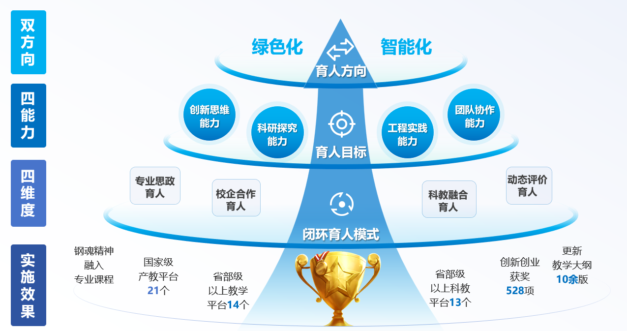 专业思政:构建“钢魂精神铸魂+专业能力强基”育人体系,将行业精神与价值引领贯穿育人全过程;校企合作:联合宝钢、首钢等企业,共建21个国家级工程实践教育中心,企业从人才需求调研、培养方案制定、课程建设、实践指导到人才质量评价深度参与学生培养全链条;科教融合:开放国家、省部级重点实验室,推行“导师+项目”模式,本科生全员参与SRTP,基于实际科研课题开展创新创业训练和毕业论文;动态评价:联合第三方专业机构,建立毕业生与用人单位跟踪反馈机制,通过问卷、深度访谈等形式收集数据,反馈培养方案与教学大纲迭代,形成“数据驱动-评价反馈-持续优化”的育人闭环。