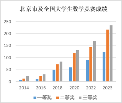 所构建的人才培养体系育人效果好,学生的创新能力显著提高,各类竞赛屡获佳绩。实践教学与竞赛活动提升了学生理科思维能力,培养了学生解决实际问题的意识和能力。各类竞赛获奖数量与获奖比例都位列北京赛区前茅。