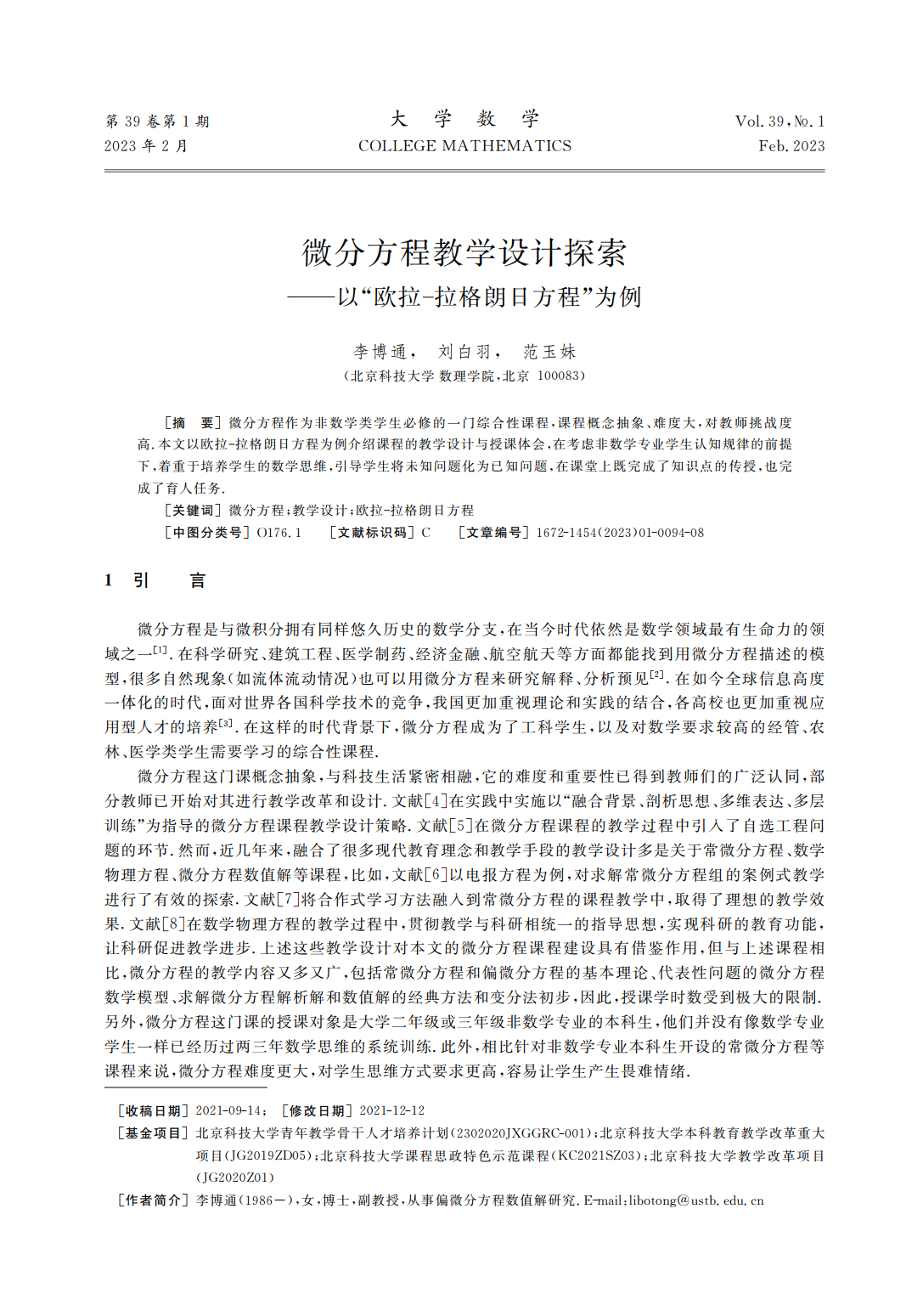 [19] 李博通,刘白羽,范玉妹. 微分方程教学设计探索——以“欧拉-拉格朗日方程”为例. 大学数学,2023,39(1):94-101.