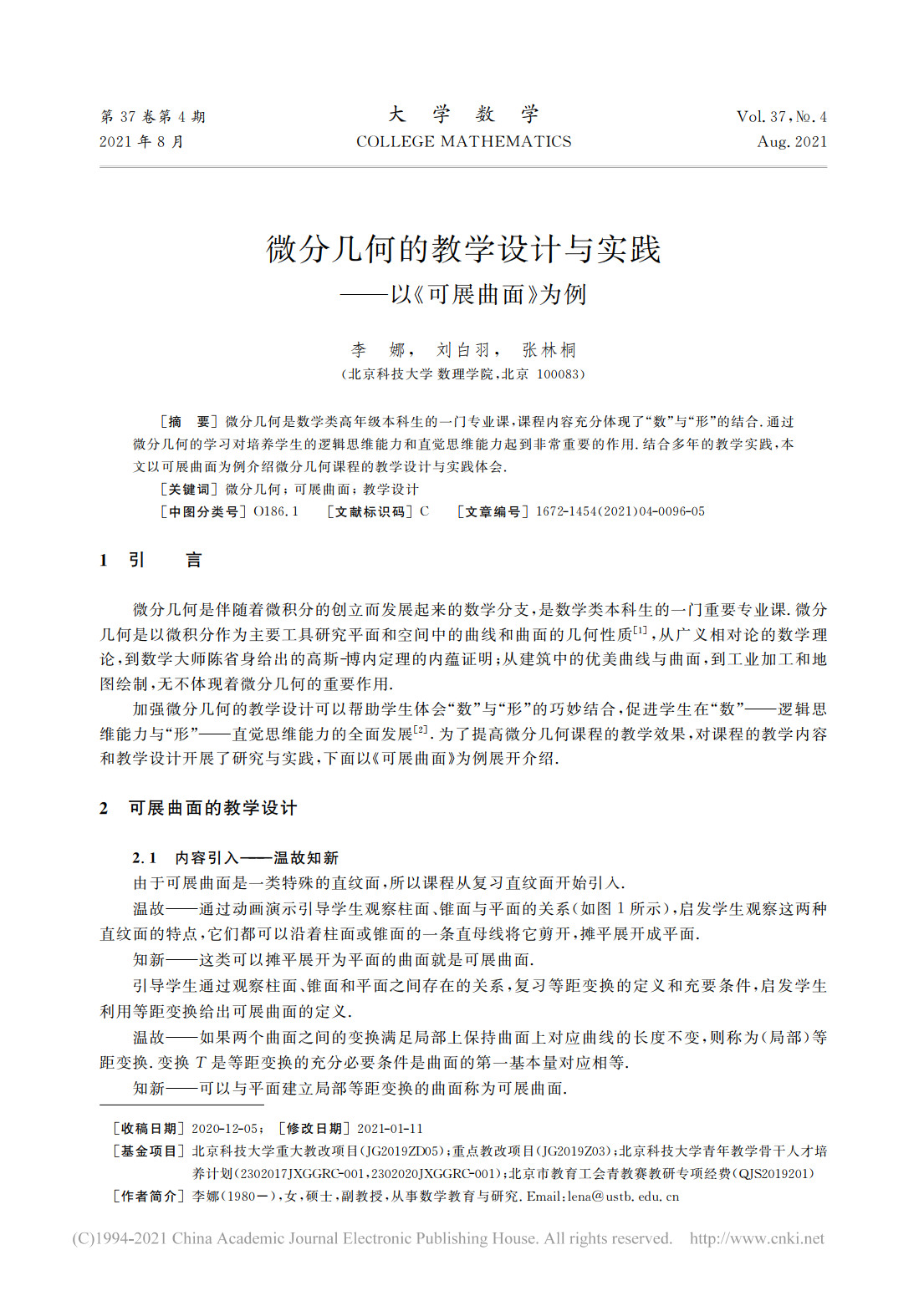 [12] 李娜,刘白羽,张林桐. 微分几何的教学设计与实践——以《可展曲面》为例. 大学数学,2021,37(4):96-100.